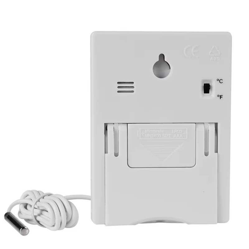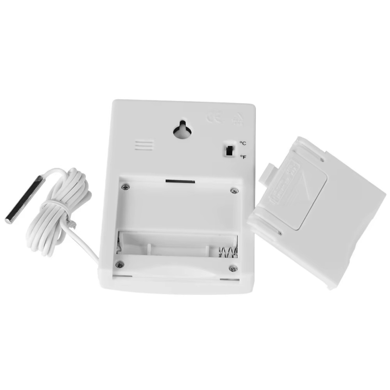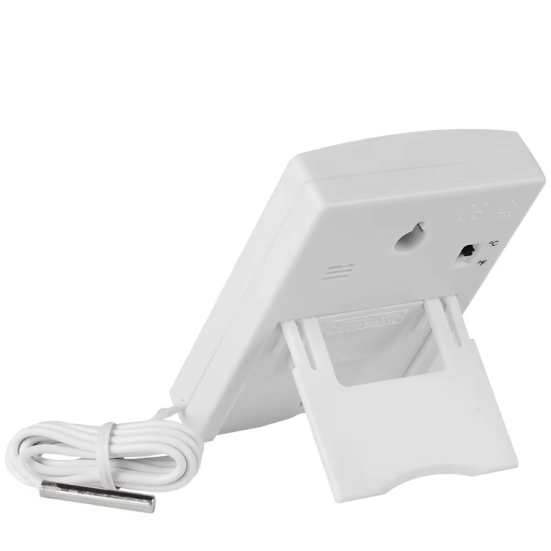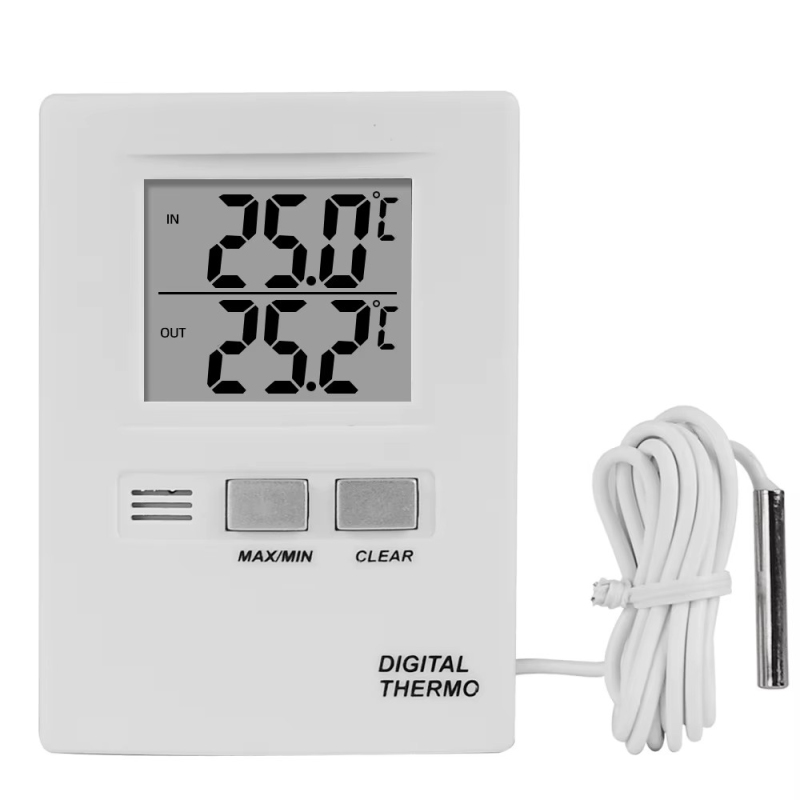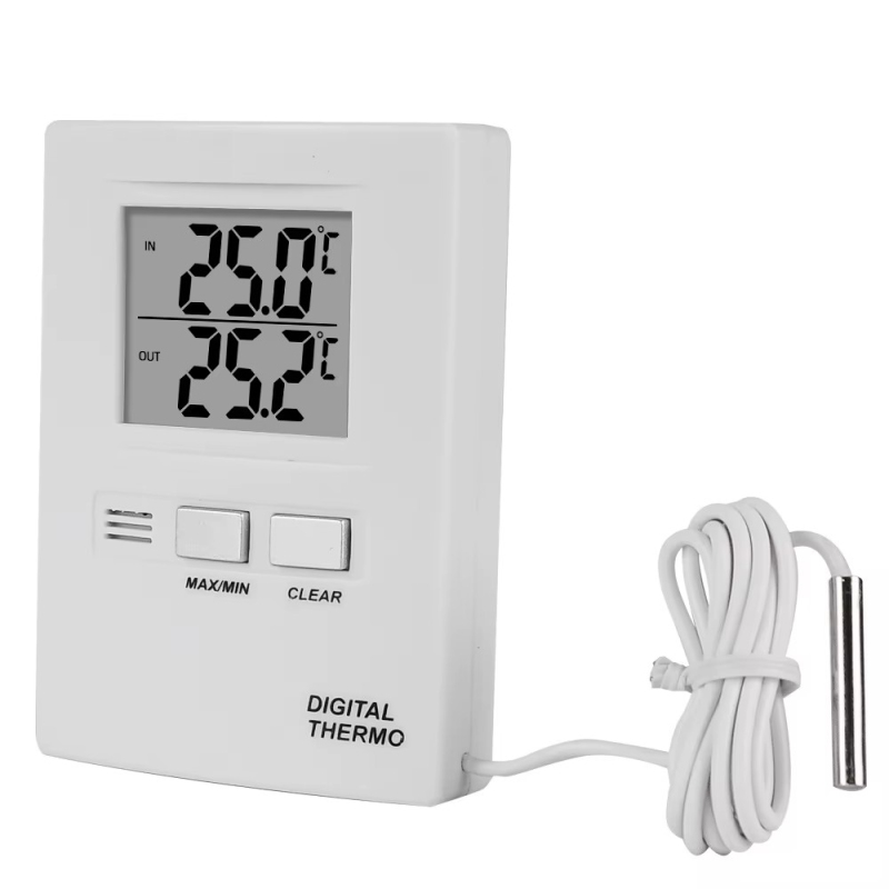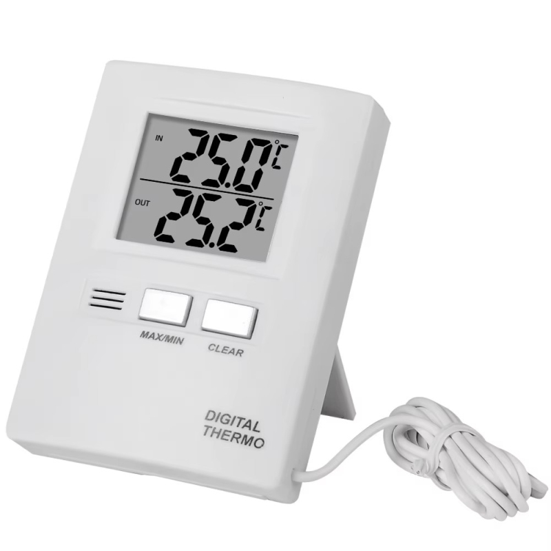 Digitální teploměr s ukazatelem venkovní a vnitřní teploty. Teploměr má paměť pro maximální a minimální naměřenou teplotu. Teploměr lze zavěsit na zeď nebo postavit pomocí stojánku na vodorovnou plochu.