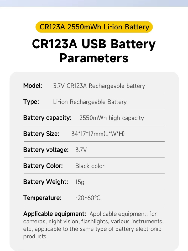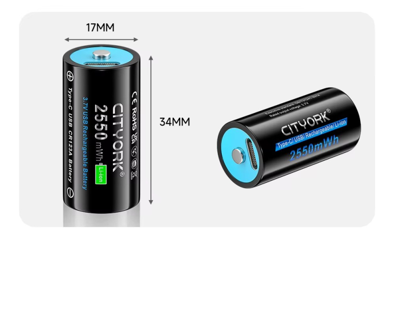 Značka: CITYORK Model: CR1123A 3,7 V lithium-iontová baterie Napětí: 3,7 V Nabíjecí napětí: 4,2 V Vybíjecí napětí: 3,7 V Kapacita: 2550 mWh Rozměr: 17 x 34 mm Nabíjecí cykly: Minimálně 1200 cyklů Led indikátor stavu nabití V balení čtyři kusy + nabíjecí kabel USB-C