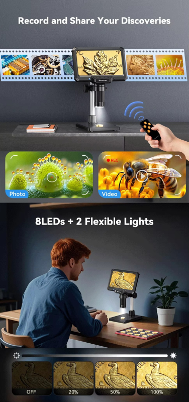 Zvětšovací mincový mikroskop má 8 vestavěných nastavitelných LED světel. Jas světel můžete upravit posunutím „nastavovacího kolečka LED“, abyste zajistili, že vaše vzorky budou jasné a jasné, což je vhodné pro detaily objektů v různých prostředích. Tento mikroskop vám poskytne skvělé detaily a vynikající zážitek.