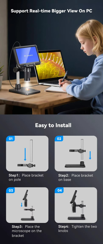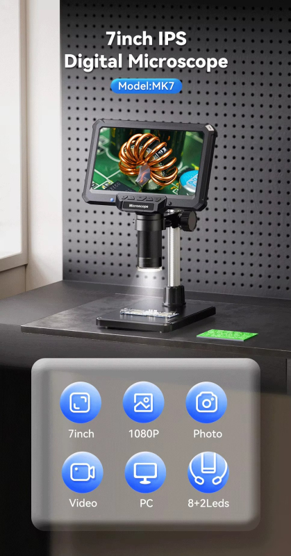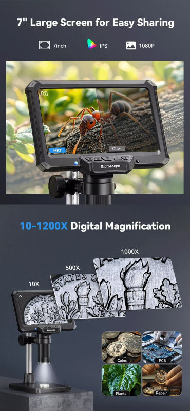 Tento digitální mikroskop je vybaven 7" palcovým displejem a má také 2 megapixelovou kameru s ultra-přesným zaostřením a zobrazení s vysokým rozlišením 1920 x 1080.