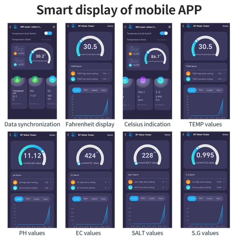 5v1 multifunkční měření: monitorování pH, EC, S.G., soli a teploty s vysokou přesností a rychlou odezvou.