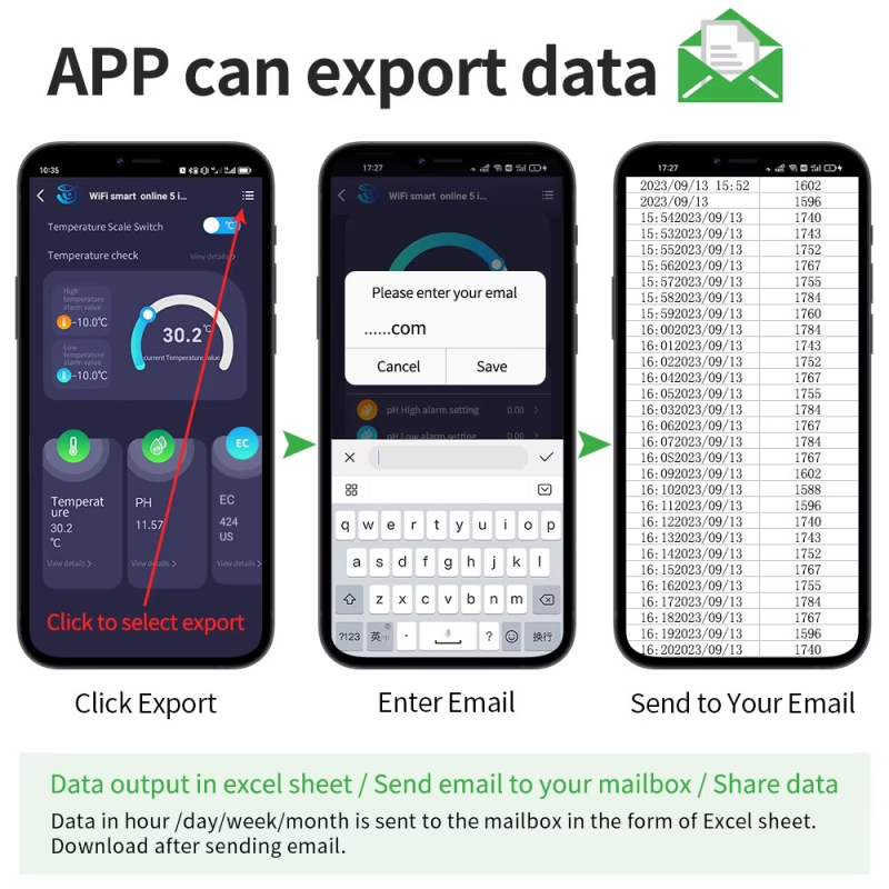 Export do Excelu: naměřené hodnoty lze automaticky odesílat do e-mailu ve formě tabulky (hodinové, denní, týdenní i měsíční záznamy).