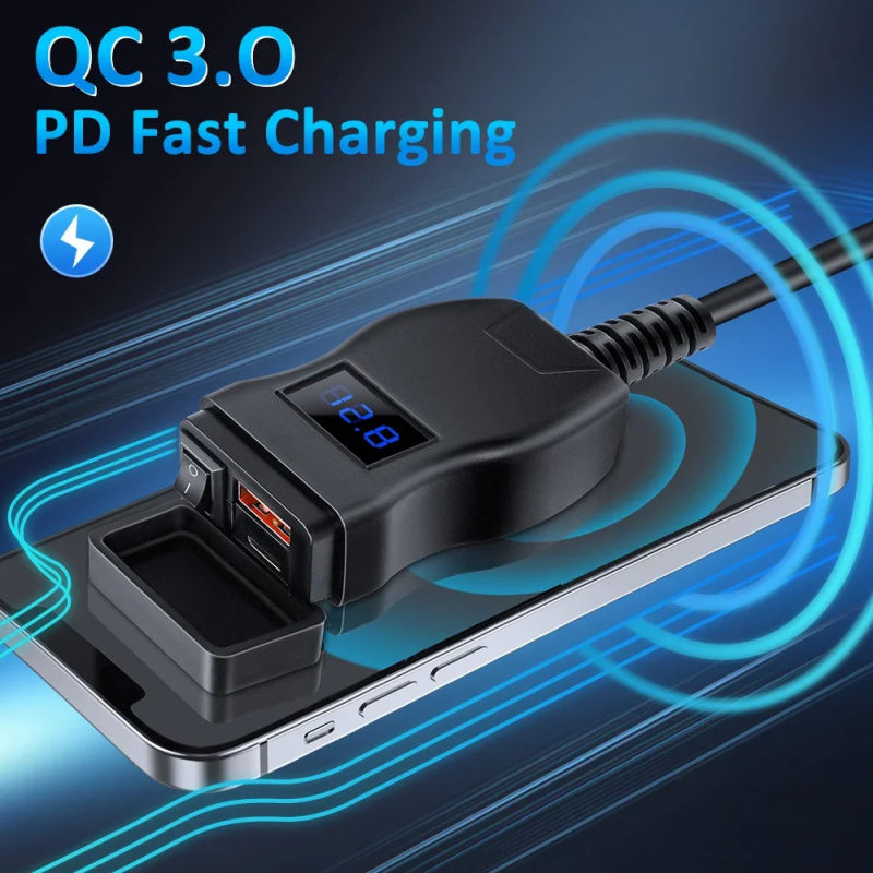USB-C nabíječka na motorku, vypínač, voltmetr, rychlé nabíjení